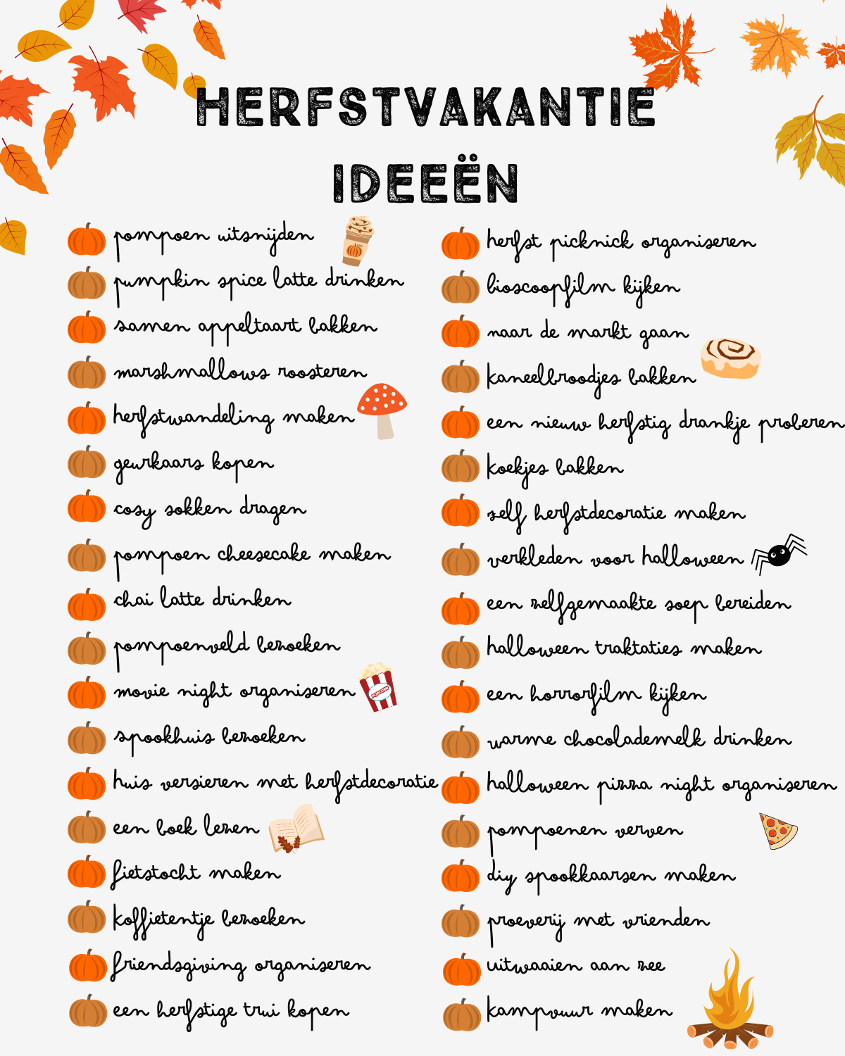De herfstvakantie is de perfecte periode om te genieten van de herfst. Beleef de herfst buiten of kruip juist lekker met een warm dekentje op de bank. Heb je wat inspiratie nodig en ben je op zoek naar herfstvakantie tips? Wij hebben de perfecte bucketlist gemaakt om jou op weg te helpen. Van pompoen versieren tot aan een herfstwandeling maken. Wij hebben de leukste herfstvakantie ideeën op een rijtje gezet.