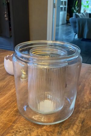 Plaats de smalle vaas in de grote vaas. Je kunt eventueel de vazen aan elkaar vast lijmen voor extra stabiliteit, maar dit is meestal niet nodig. Er ontstaat nu een ruimte tussen de twee vazen die open blijft.