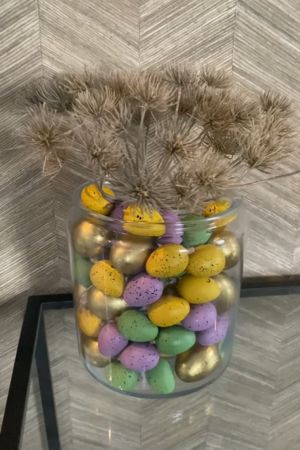 Vul de vaas met mooie paastakken of voorjaarsbloemen voor een gezellig eindresultaat. Zet ‘m neer het geheel neer op de eettafel of een bijzettafeltje. Laat de paashaas maar komen!