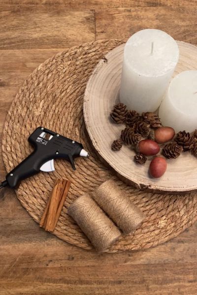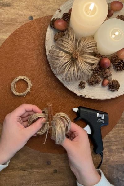 Als je de bundeltjes touw hebt, ga je ze vastmaken aan het kaneelstokje. Doe wat lijm op het knoopje waar je de bundels mee vast hebt gemaakt en druk deze stevig op het kaneelstokje. Zorg ervoor dat de bovenkant van het stokje zichtbaar blijft, dat wordt straks de steel van de pompoen.