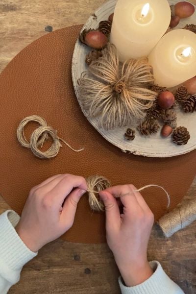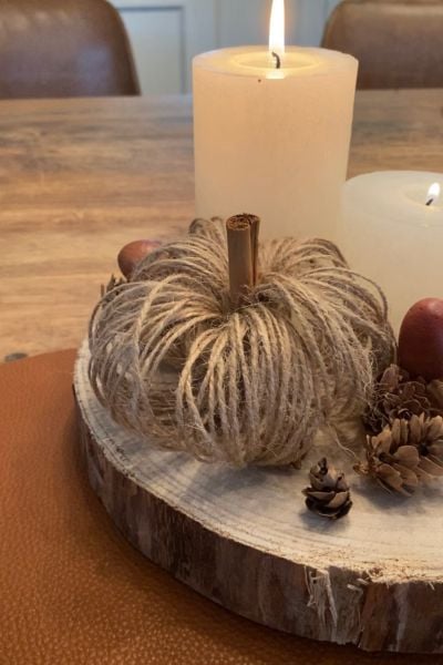 Als alle touwbundeltjes aan de pompoen vastzitten, kun je de touwtjes iets uit elkaar trekken. En voilà! In drie eenvoudige stappen heb je deze super leuke herfstdecoratie gemaakt.