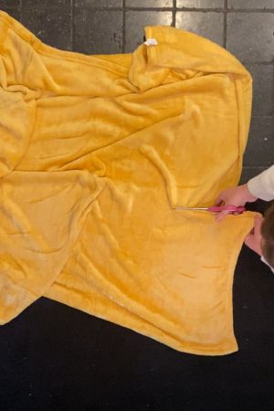 Knip een rechthoek uit het (oude) fleecedeken van ongeveer 30x40 cm. Wil je liever een groter kussen? Geen probleem. Dan knip je gewoon een groter rechthoek uit het deken.