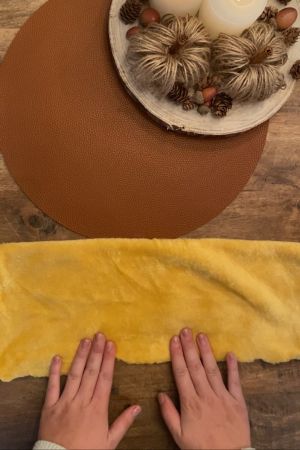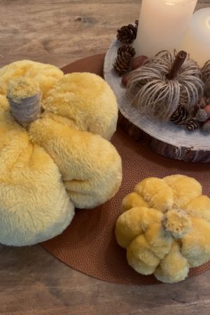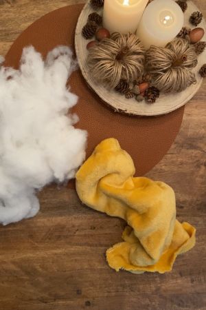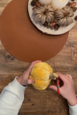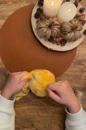 Als de pompoen z’n mooie vorm heeft gekregen, maak je de steel. Wikkel het touw om de bovenkant van de pompoen, waar je het kussen dicht hebt geknoopt. Doordat je nog deken over hebt, blijft de steel goed overeind staan. Knip tenslotte het overige deken af van de steel.