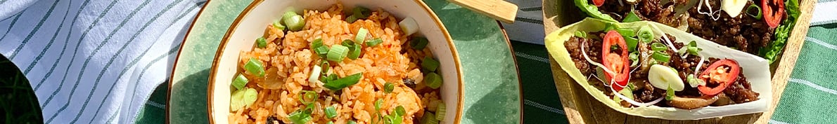 Tips: Voor gebakken rijst werkt koude rijst van een dag oud beter dan hete stomende rijst. Voeg de tweede portie sesamolie pas aan het einde van het koken toe. Mis je de eiwitten? Voeg fijngehakte gerookte tofu toe voor kimchi. Dit gerecht gaat goed samen met geraspte vegan kaas op Goudse of Parmezaanse wijze.
