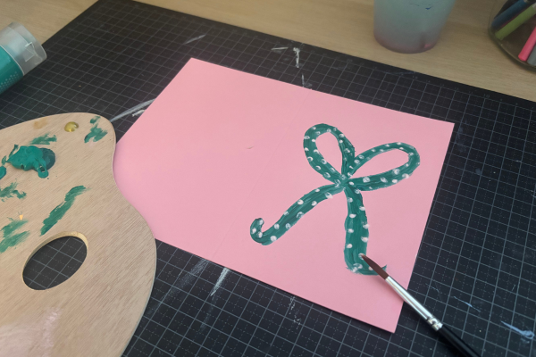 Gebruik een fijn penseel om kleine stipjes op de strik te zetten. Dit geeft de kaart een speelse en feestelijke uitstraling. Ga voor een kleur die mooi contrasteert, zoals wit of een andere tint die je hebt gebruikt voor de strik.
