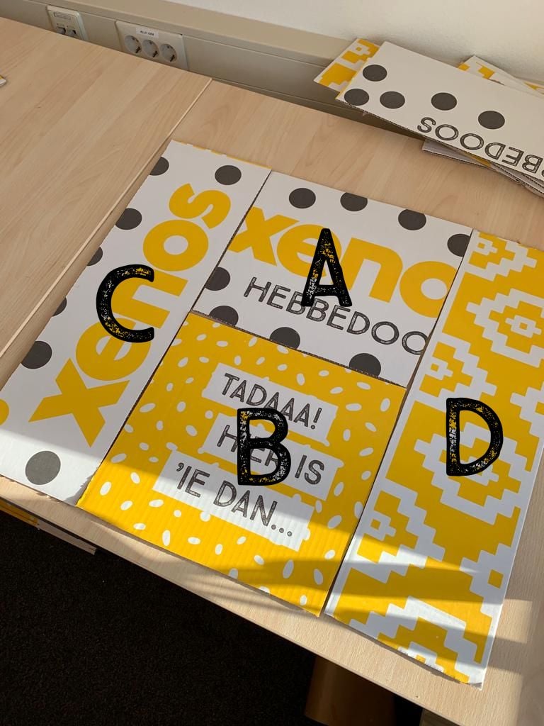 Nu ga je drie van de vier zijdes van het onderste vierkant (B) met plakband vastplakken aan de andere stukken karton (A, C, D). Op de foto hieronder is dat aangegeven met rode lijnen: