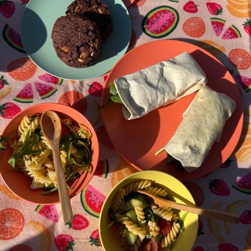 Eenmaal op je kleed serveer je alles op vrolijk buitenservies: onze lichtgewicht borden en schaaltjes in zomerse kleuren maken het feest compleet. Vergeet ook de zoete snacks niet: een paar zelfgebakken koekjes (of stiekem kant-en-klaar) zijn het perfecte toetje. Alles smaakt net een beetje beter met zon op je gezicht en gras onder je voeten.