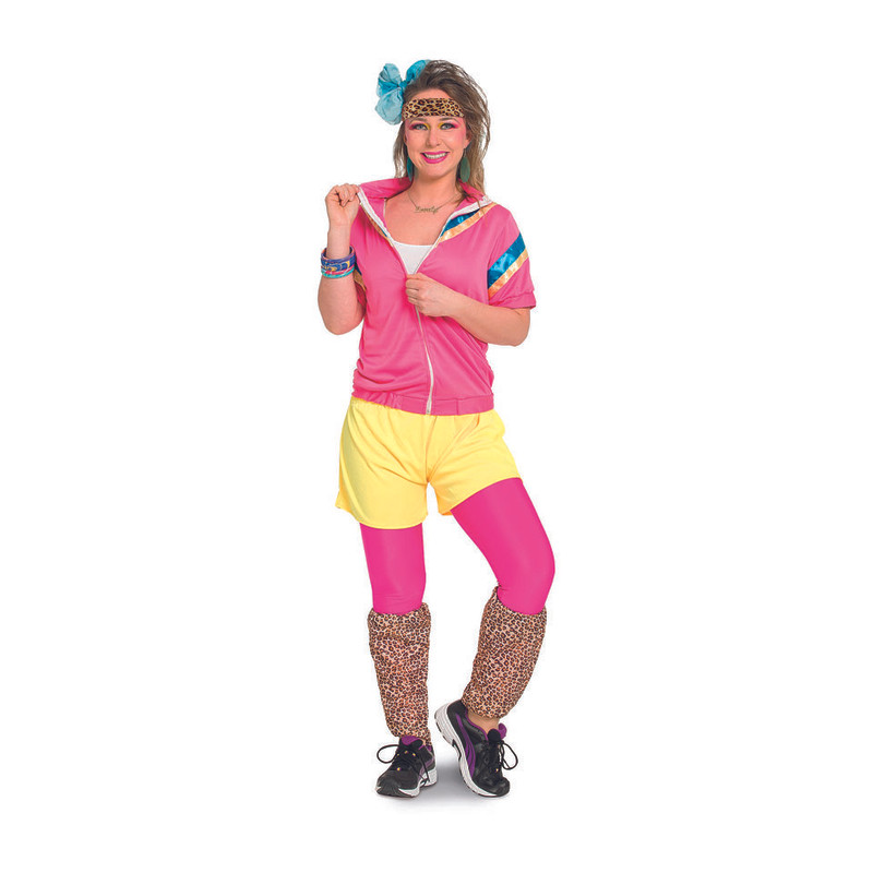 Herleef de jaren 80 met dit foute, maar grappige trainingspak voor vrouwen. In de verpakking zit een felroze trainingsjack, een geel broekje en een zweetband.
