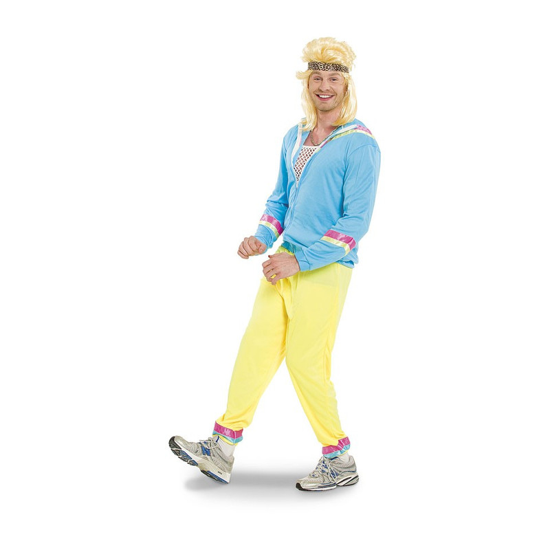 Binnenkort een jaren 80 feestje? Ga verkleed in dit jaren 80 trainingspak voor heren. Dit foute eighties outfit in neon kleuren bestaat uit een blauw trainingsjack, gele broek en een zweetband in tijgerprint.