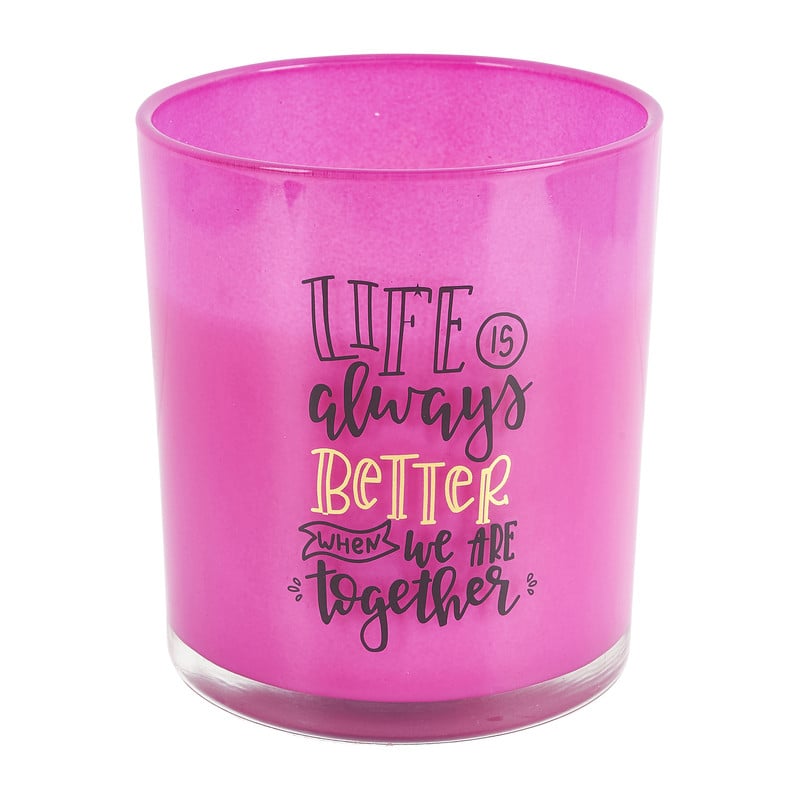 Steek dit kaarsje aan voor meer gezelligheid in huis. Het zit verpakt in een felroze glas met daarop de quote: ‘Life is always better when we are together’. De kaars brandt in totaal 40 uur. Verkrijgbaar in diverse kleuren en maten. Hiermee maak je de leukste combinaties!