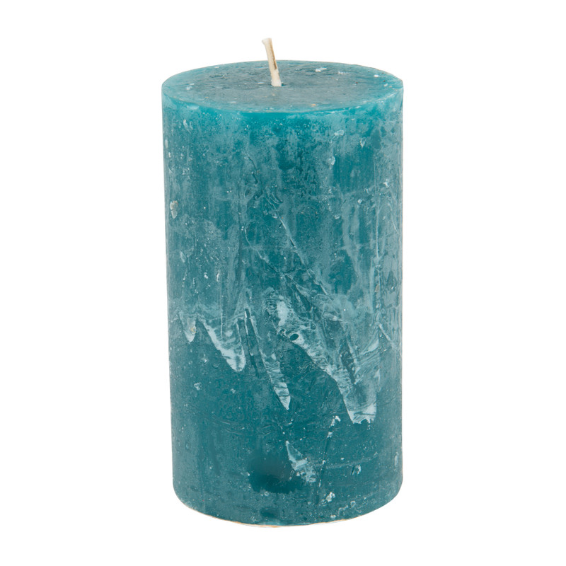 Deze kaars geeft een rustieke sfeer en is petrol van kleur. De kaars is 7 x 12 cm en heeft circa 60 branduren.
