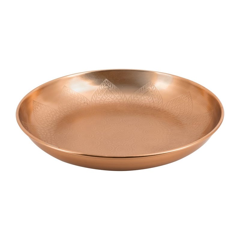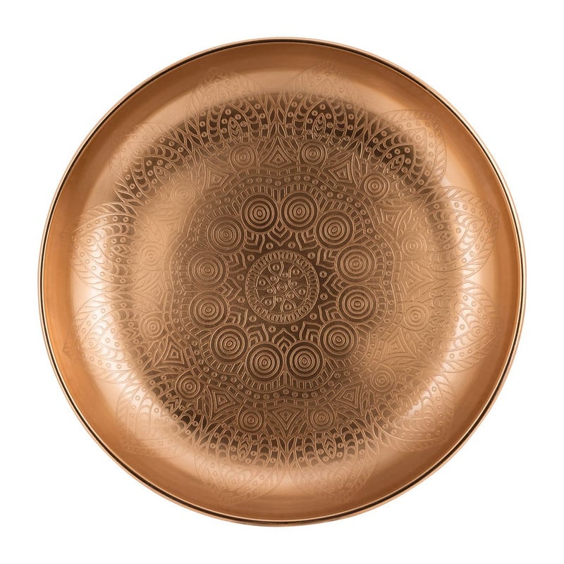 Decoreer deze schaal met leuke kaarsjes, vaasjes en andere accessoires en creëer een echte eyecatcher. De schaal is gemaakt van aluminium en heeft een koperen kleur. De diameter is 26 cm. Perfect voor op de salontafel. Leuk om te combineren met andere koperkleurige accessoires.