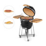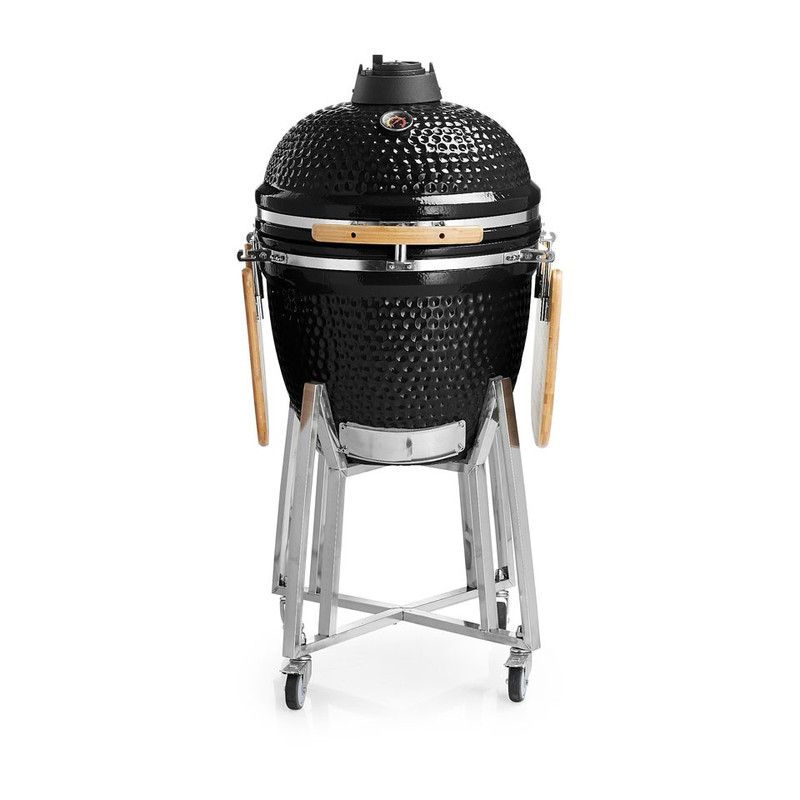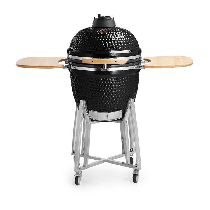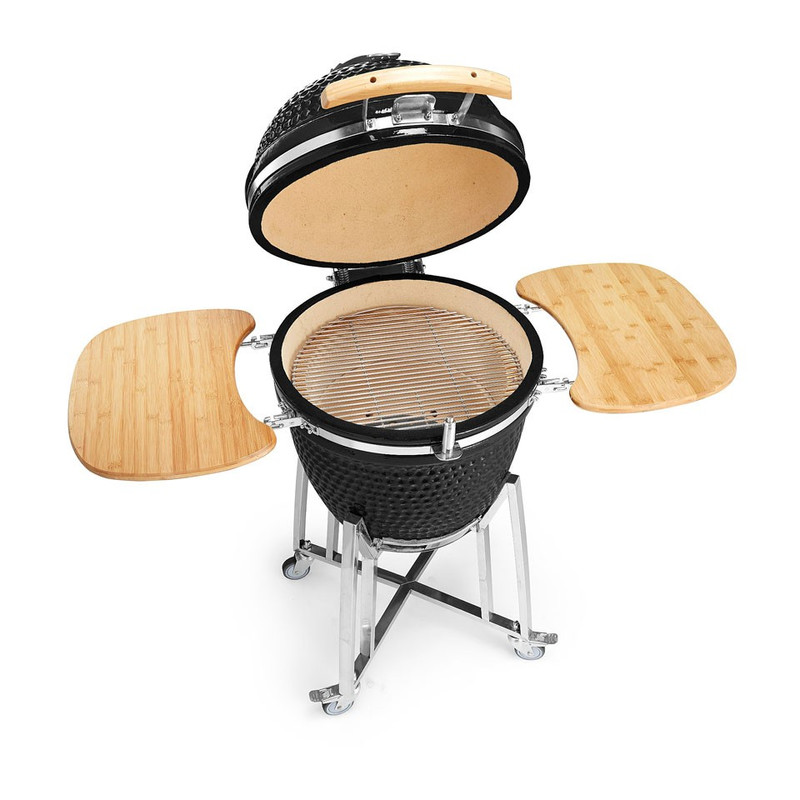 De Kamado XL family-size wordt geleverd met 2 bamboe zijtafels, een solide roestvrijstalen onderstel op gelagerde wielen.