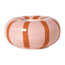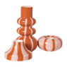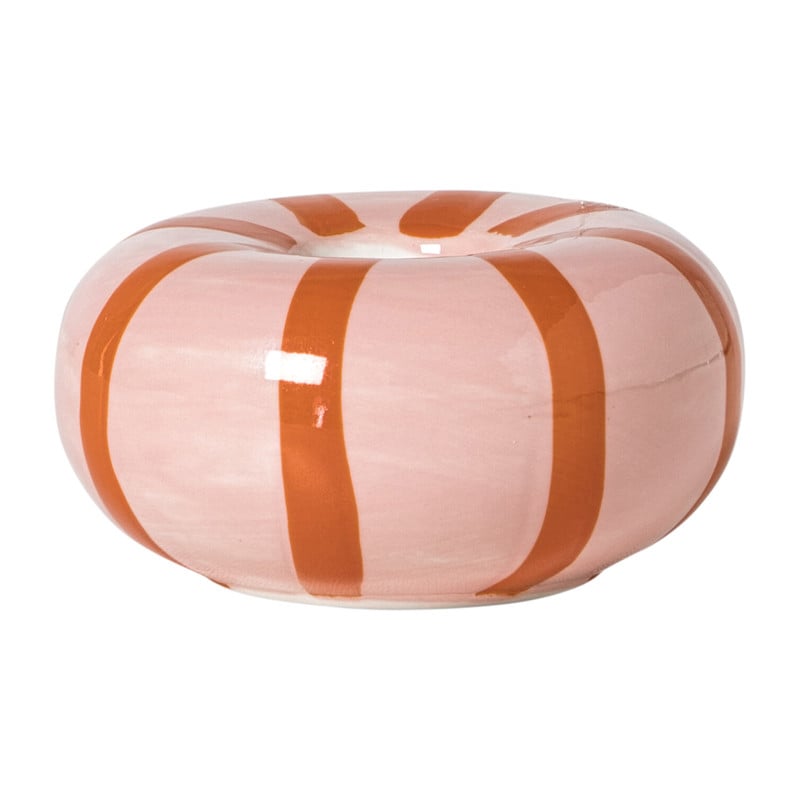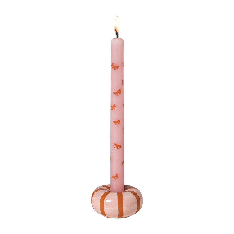 Deze kandelaar met een bolvorm en lijnen in roze en rood voegt een speelse en romantische touch toe aan je interieur! Met een diameter van 7.7 cm en hoogte van 3.3 cm is het een subtiele maar stijlvolle manier om je kaarsen te presenteren. Perfect voor op de salontafel of als sfeervolle toevoeging aan een romantisch diner.