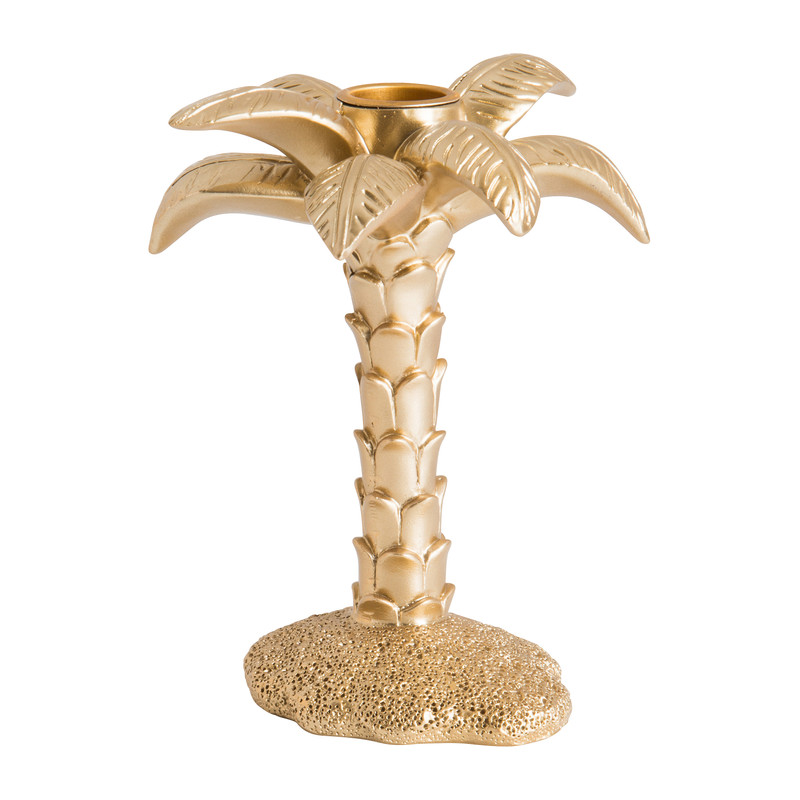 De zomer is nooit verweg met deze leuke kandelaar in de vorm van een palmboom. De kandelaar is goudkleurig en heeft een hoogte van 15 cm waardoor deze perfect is voor een dinerkaars.