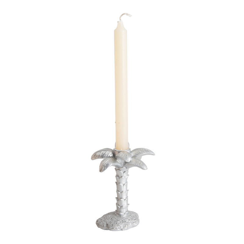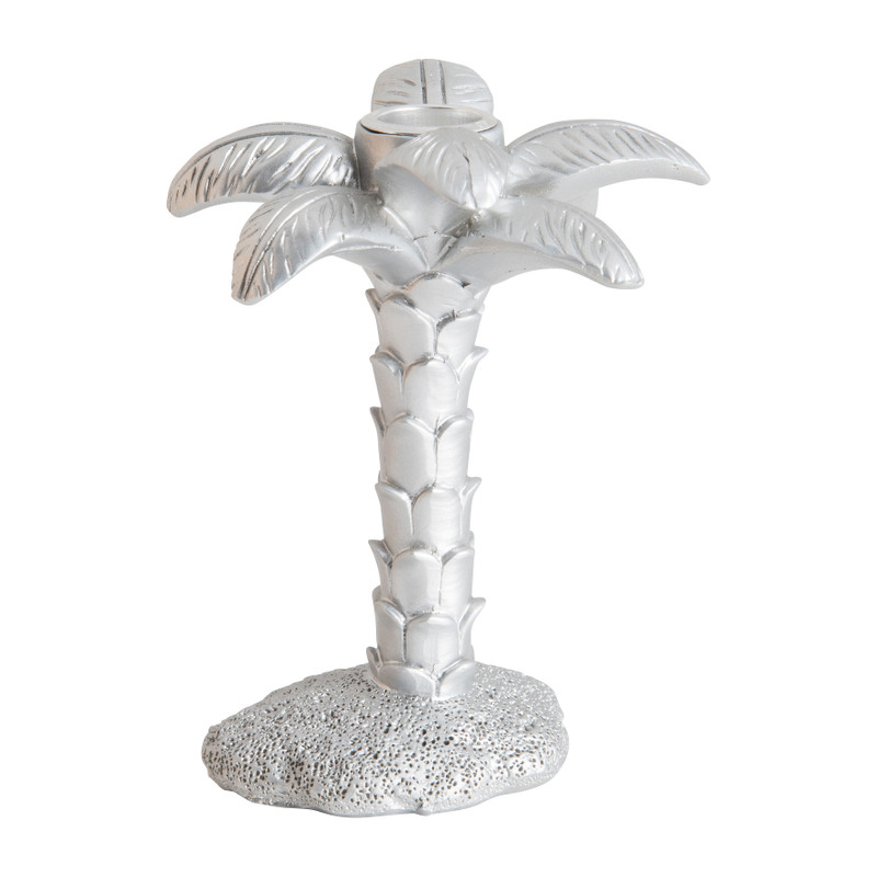 De zomer is nooit verweg met deze leuke kandelaar in de vorm van een palmboom. De kandelaar is zilver van kleur en heeft een hoogte van 15 cm waardoor deze perfect is voor een dinerkaars.
