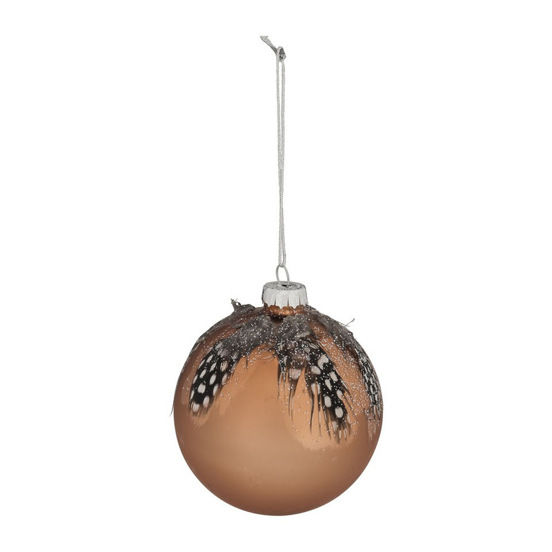 Deze glazen kerstbal is bronskleurig en is beplakt met veertjes. De bal heeft een diameter van 8 cm. Je hangt de ballen eenvoudig in de boom aan het koordje op de bovenkant.