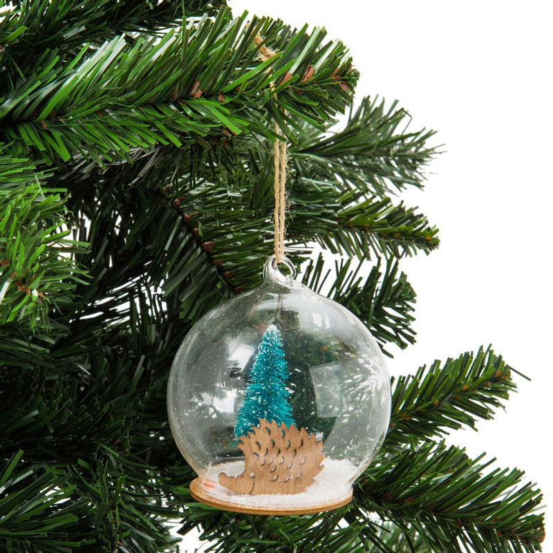 Een glazen kerstbol voor in de kerstboom. In de glazen kerstbal zit een schattig egeltje en een kerstboom. Fleur je kerstboom op met deze leuke kersthanger. Je kan 'm ook ergens op zetten want hij heeft een handige platte bodem.