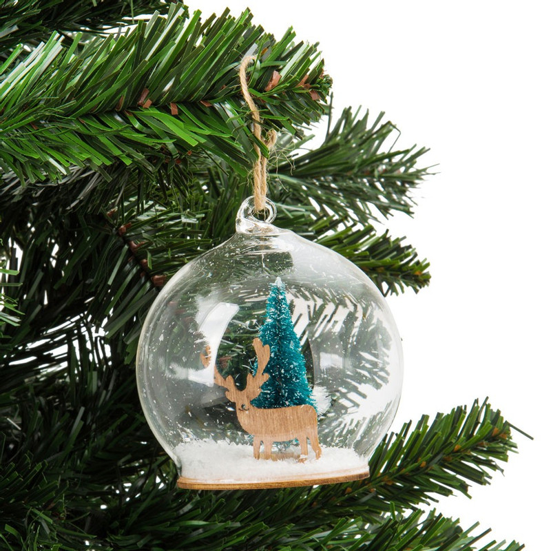 Een kersthanger voor in de kerstboom. In deze heldere glazen kerstbal zit een mooi hert met gewei en een kerstboom. fleur je kerstboom op met deze leuke kersthanger. Je kan 'm ook ergens op zetten want hij heeft een handige platte bodem.