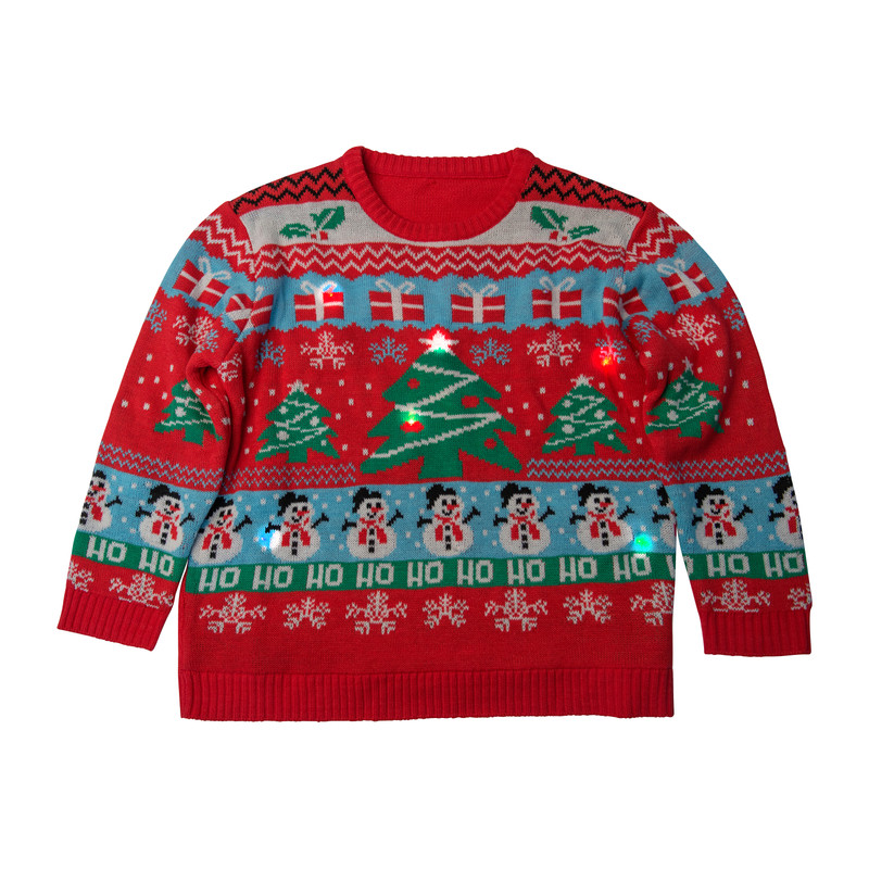 Tijdens de feestdagen wil je er natuurlijk heerlijk warm bijzitten. Een echte kersttrui mag daar natuurlijk niet aan ontbreken! Deze kersttrui met de tekst 'Ho-Ho-Ho', heeft lampjes welke van kleur veranderen. De trui is te dragen als maat M/L.