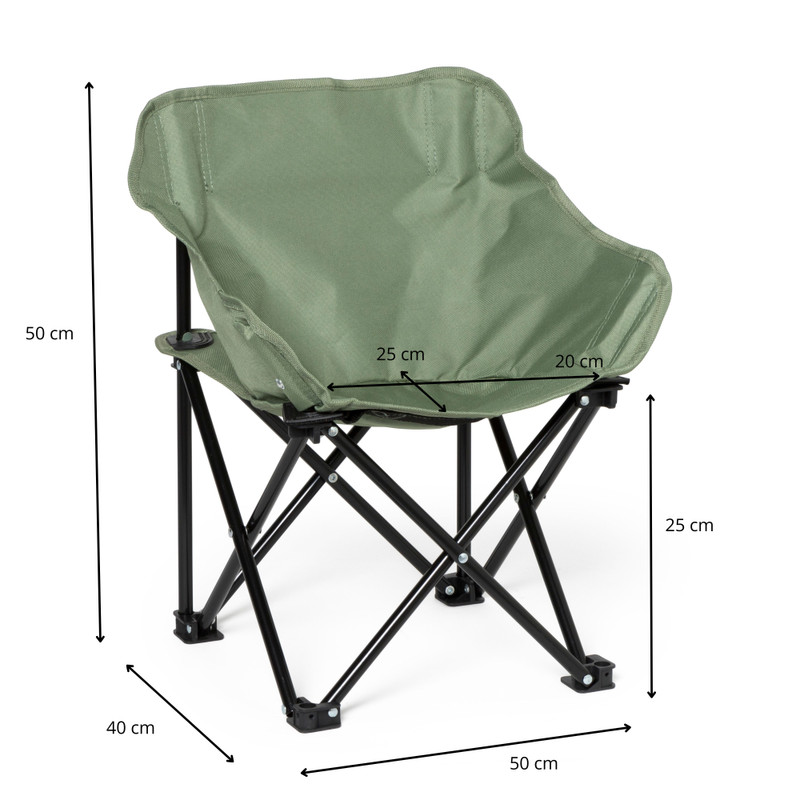 De kids campingstoel heeft een hoogte van 50 cm, een breedte van 50 cm en een diepte van 40 cm. De zithoogte van deze stoel is 25 cm, de zitbreedte 20 cm en de zitdiepte 25 cm.