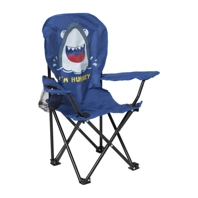 Deze opvouwbare kindercampingstoel neem je heel gemakkelijk mee. Zo kun je overal heerlijk relaxt zitten. De stoel kan gebruikt worden op de camping, maar is ook makkelijk mee te nemen in de bijgeleverde tas naar het strand of park. De stoel met haaien print is gemaakt van metaal en polyester en heeft een hoogte van 66 cm, een breedte van 55 cm en een diepte van 32 cm. In één armleuning zit een gat met een netje waarin je een flesje drinken kunt zetten.