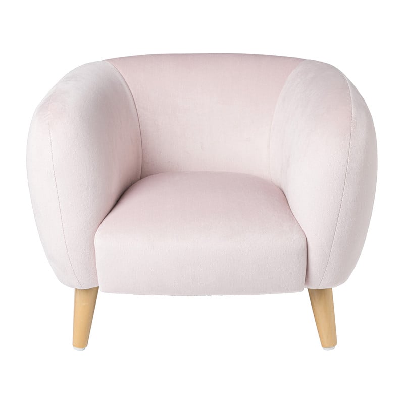 De fauteuil is gemaakt van polyester en heeft een lichtroze kleur.