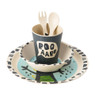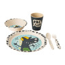 Dit leuke 5-delige bamboe kinderservies is een geweldige set voor kleine kinderen. De set heeft prachtige gekleurde tekeningen en is gemaakt van organische biologisch afbreekbare bamboevezel. De set bestaat uit een bord (21cm), een diep bord (15,5xH4,5cm), een vork en een lepel (13,5cm) en een bijbehorende beker (0,27l). Het product kan niet in de vaatwasser, magnetron en oven.