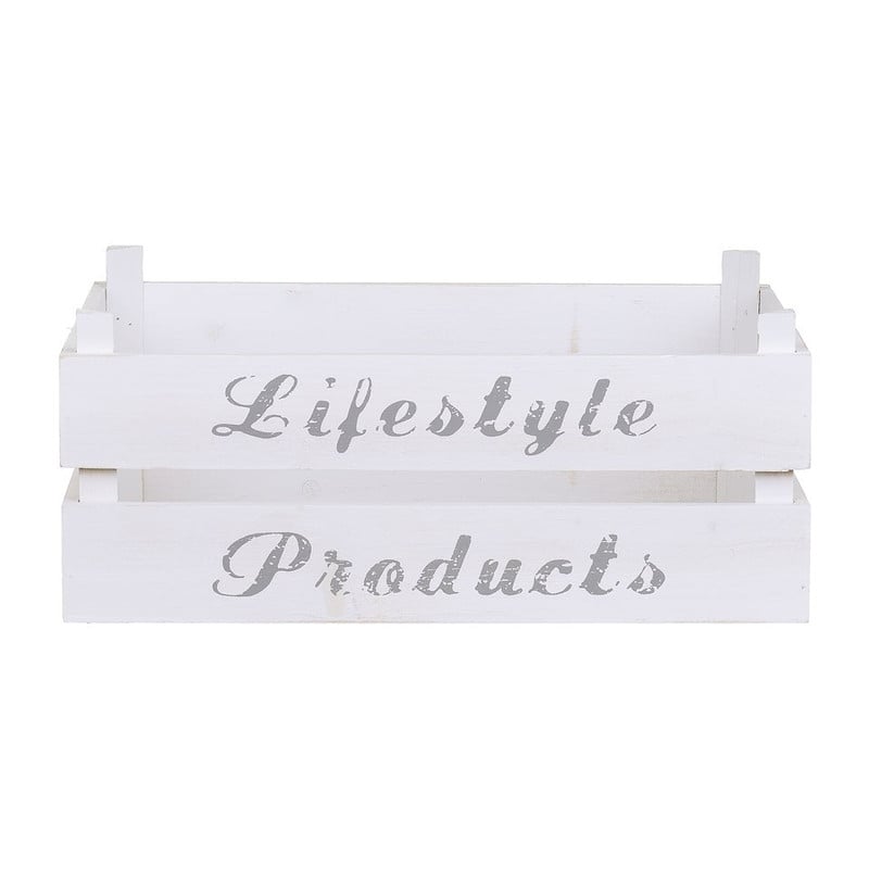 Deze grote kist heeft een decoratief ontwerp dat ontzettend leuk binnenshuis gebruikt kan worden. Het witte krat is namelijk gemaakt van hout en heeft een mooie, sierlijke tekst op de voorkant. In grijze letters staat hier ‘lifestyle products’ op geschreven. Zet deze kist naast de bank in de woonkamer, of naast het televisiekastje. Vul hem met al je favoriete tijdschriften of met een verzameling dvd’s. Zo heb je altijd iets te doen als er een keer niks op televisie is. Pak gewoon iets te lezen uit de opbergkist, of ga voor een spannende film. Leg er ook nog een fleecedeken in waar je onder kunt kruipen tijdens koude winteravonden. Schroef nog vier kleine wieltjes onder de krat zodat je hem ook makkelijk kunt verplaatsen. Ideaal! De afmetingen zijn 30x40x17 cm en er zijn ook nog twee kleinere kistjes verkrijgbaar.