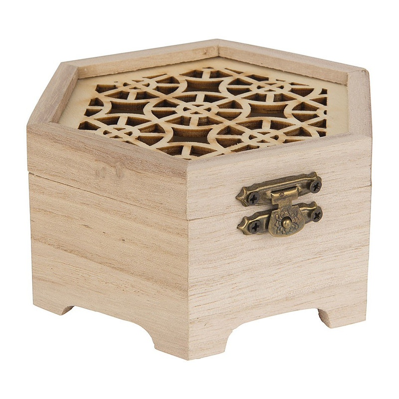 Dit zeshoekige kistje heeft een afmeting van 10x11x6 cm en is gemaakt van hout. Dankzij het open houtwerkje is het een decoratief exemplaar. Een leuk kistje om allerlei klein spul in op te ruimen. Naast dit formaat, hebben ‘m ook in een iets grotere variant.