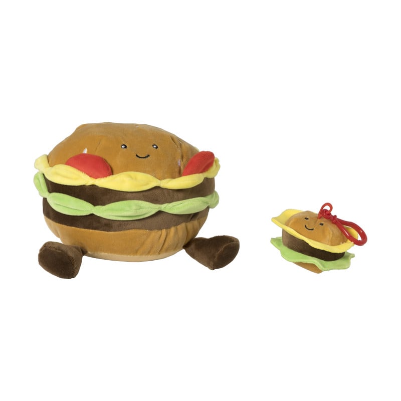Deze hamburgerknuffel heeft alles: een zacht broodje, knuffelbare kaas en een speels gezichtje.