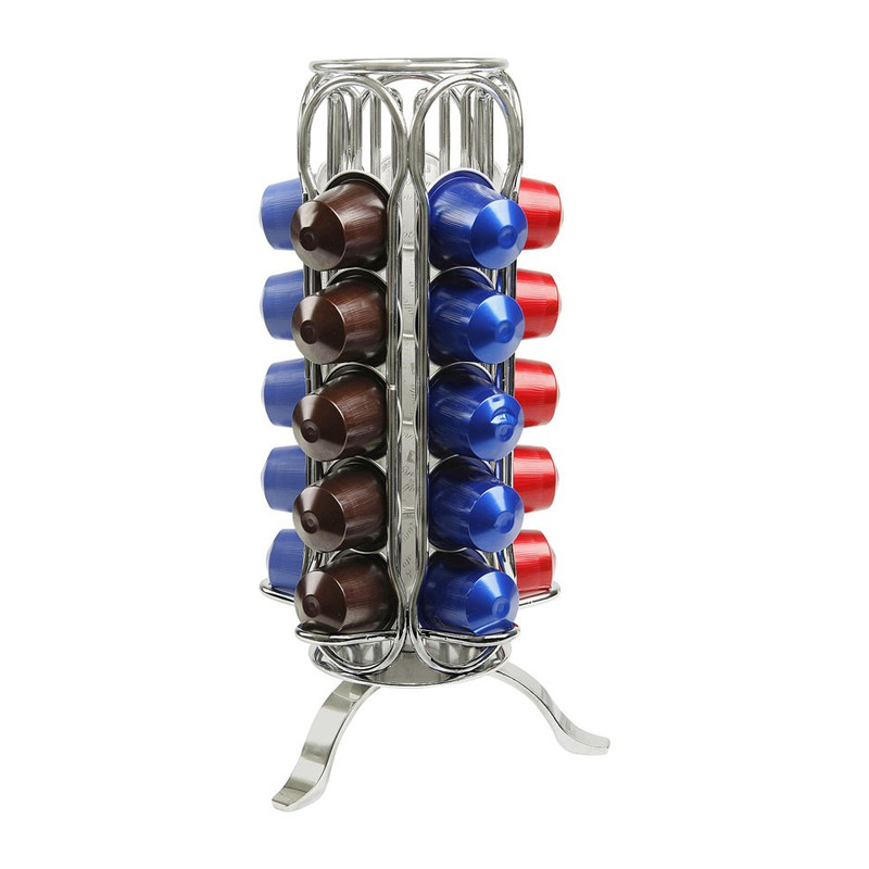 Koffiecupshouder voor Nespresso capsules. Roteerbaar voor eenvoudig gebruik. In de houder is plaats voor maximaal 30 cups. Met deze handig roteerbare koffiecupshouder voor Nespresso capsules kies je gemakkelijk je smaak naar keuze. De houder heeft een hoge cilindervorm met daarin vijf rijen en een mooie chromen afwerking. De vijf rijen bieden samen plaats aan een maximum van dertig Nespresso koffiecapsules.