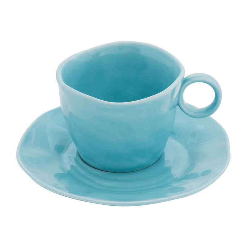 Laat uw visite genieten van een heerlijk bakje koffie of thee met dit bijzondere pastelblauwe kopje en schoteltje van de Ilori serie. Het kopje staat niet in het midden van het schoteltje wat zorgt voor een speels effect. Het kopje en schoteltje zijn goed te combineren met ander servies uit de serie. Het setje heeft een subtiel design, wat ontzettend leuk in een landelijk of Scandinavisch interieur staat. De ongelijke golvende randen geven het servies een extra touch.