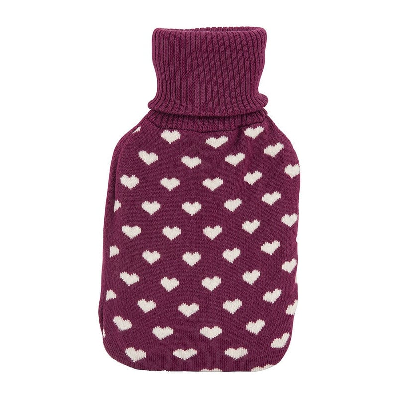 Deze kruik met inhoud van 1.5 liter is perfect om bij je te hebben liggen op koude winteravonden. De rubberen kruik is voorzien van een roze gebreide hoes met witte hartjes.