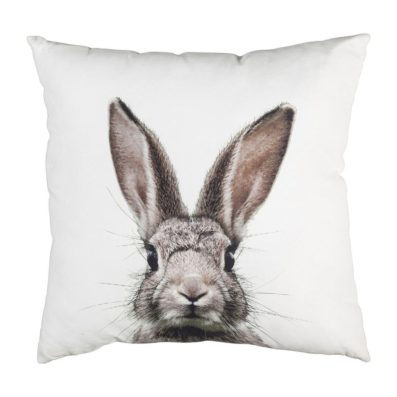 Blaas je interieur nieuw leven in met dit leuke haas kussen. Het kussen is wit van kleur en is voorzien van een afbeelding van een haas. Ideaal als decoratie voor op de sofa, fauteuil of zelfs het bed. Het haas kussen heeft een afmeting van 40x40 cm. De hoes is gemaakt van polyester.