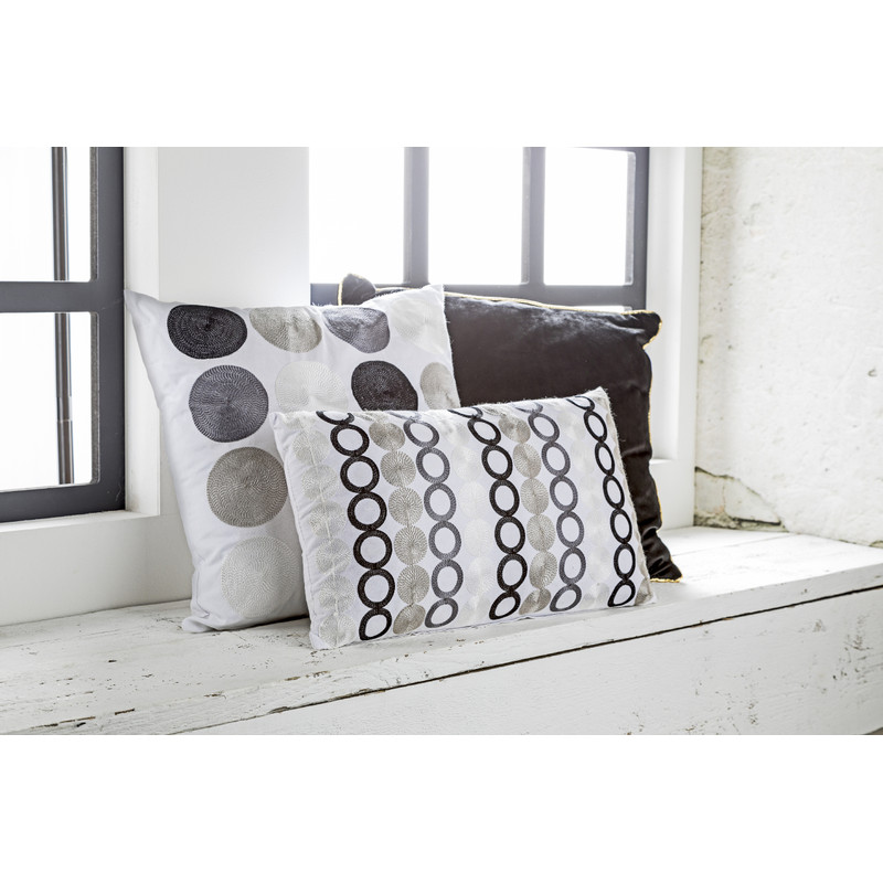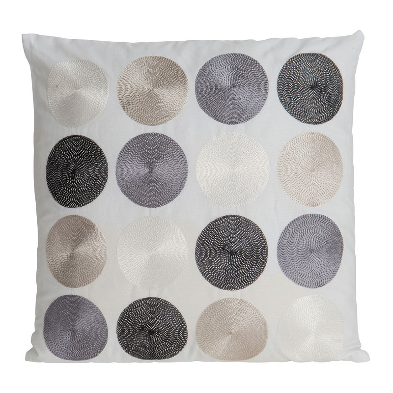 Dit kussen met geborduurde stippen past dankzij de neutrale kleuren in vrijwel elk interieur. Het kussen heeft geborduurde stippen in metallic grijze en zwarte kleuren. De afmeting van het kussen is 45x45 cm en is gemaakt van katoen. Het kussen is eenvoudig te wassen in een handwasje, dankzij de afneembare hoes.
