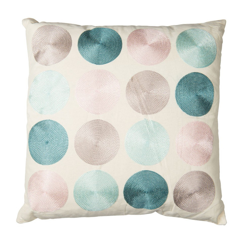 Het kussen heeft geborduurde stippen in metallic grijze, blauwe en roze kleuren. De afmeting van het kussen is 45x45 cm en is gemaakt van katoen. Het kussen is eenvoudig te wassen in een handwasje, dankzij de afneembare hoes.