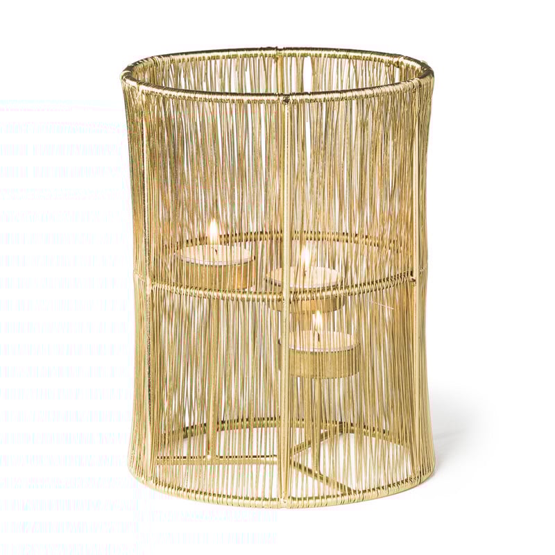 Deze lantaarn met draadjes frame is een echte eyecatcher. Het is helemaal van goud van kleur en dat valt lekker op! In de lantaarn passen meerdere theelichten. De diameter is 15 cm en de hoogte is 20 cm.