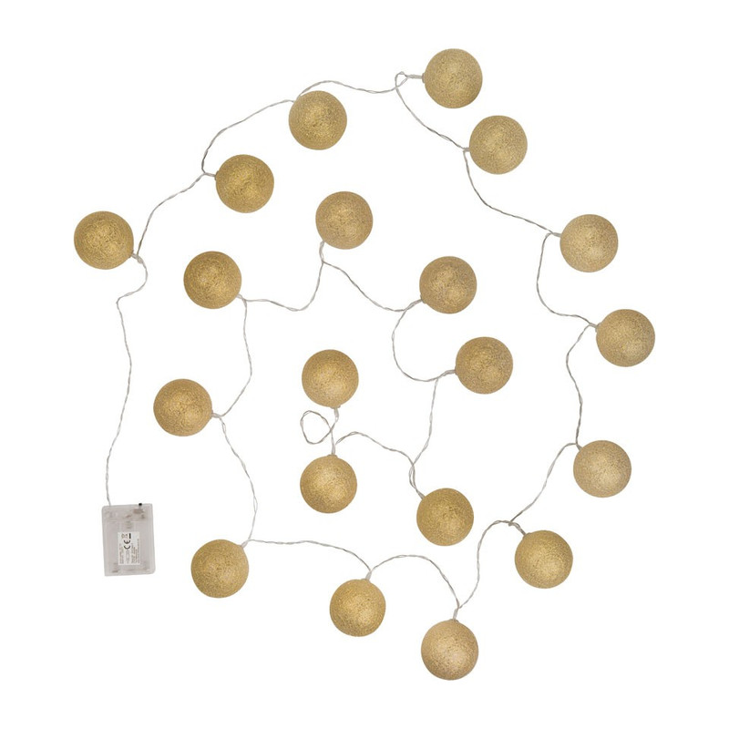 Lichtslingers zijn een hippe manier van verlichting in huis. De gouden lichtslinger met cotton balls brengt sfeer en gezelligheid in je interieur. Het verlichtingssnoer is 300 cm lang en is voorzien van 20 LED-lampjes. De lampjes werken op 2 AA batterijen, je hebt dus geen stopcontact nodig.