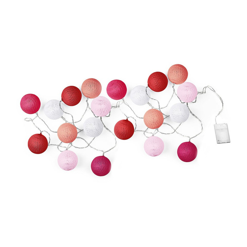 Super sfeervolle lichtslinger met witte, roze en rode katoenen ballen! Leuk om je woonkamer, hal of slaapkamer mee te verlichten tijdens de donkere, koude wintermaanden. De lichtslinger met cottonballs is mooi om op te hangen, een grote glazen pot mee te vullen of een dressoir mee te versieren. Het verlichtingssnoer is in diverse kleuren en afmetingen verkrijgbaar. Deze snoer is ruim 300 cm lang en heeft 20 led-lampjes. De lampjes werken op 3 AA batterijen, dus je hebt geen stopcontact nodig. Handig!