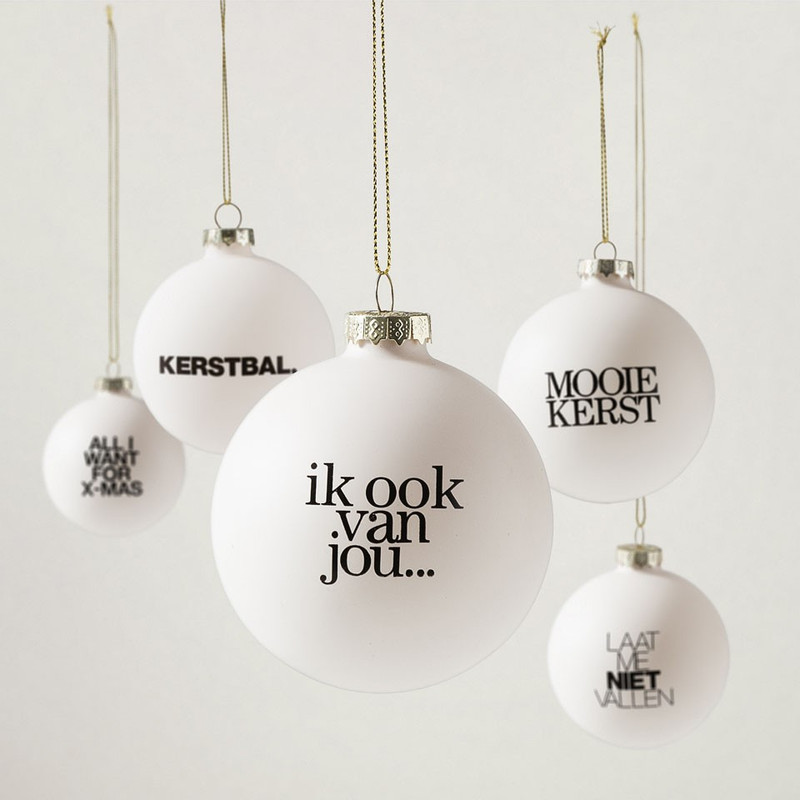 In totaal zijn er 8 speciale kerstballen ontwikkeld met ieder een andere tekst. 4 lieve teksten en 4 teksten met een knipoog. De kerstballen zijn exclusief te koop bij ons, online of in de winkels.