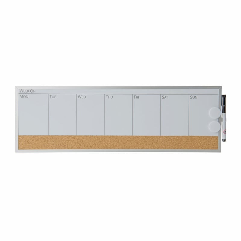 Handige weekplanner om al jouw to-do dingen op te schrijven en briefjes op te hangen. De onderste rand is van kurk en hier kun je met punaises briefjes aan ophangen. Er zitten 2 magneten en een stift bij. De bovenkant van de stift is ook meteen een wisser. Het bord heeft een afmeting van 19x58 cm.