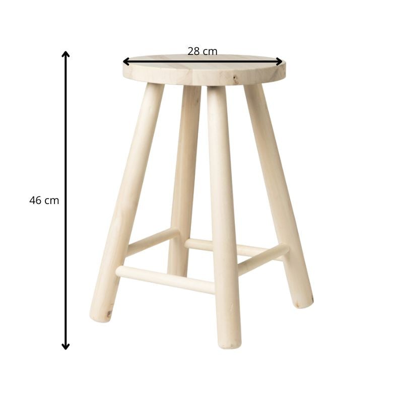 Dit melkkrukje staat stoer in jouw interieur. De ronde kruk heeft vier stevige poten en een natuurlijke kleur. De kruk is gemaakt van populieren hout en heeft een afmeting van ø28x46 cm. Het maximale draagvermogen van dit melkkrukje is 100 kg.
