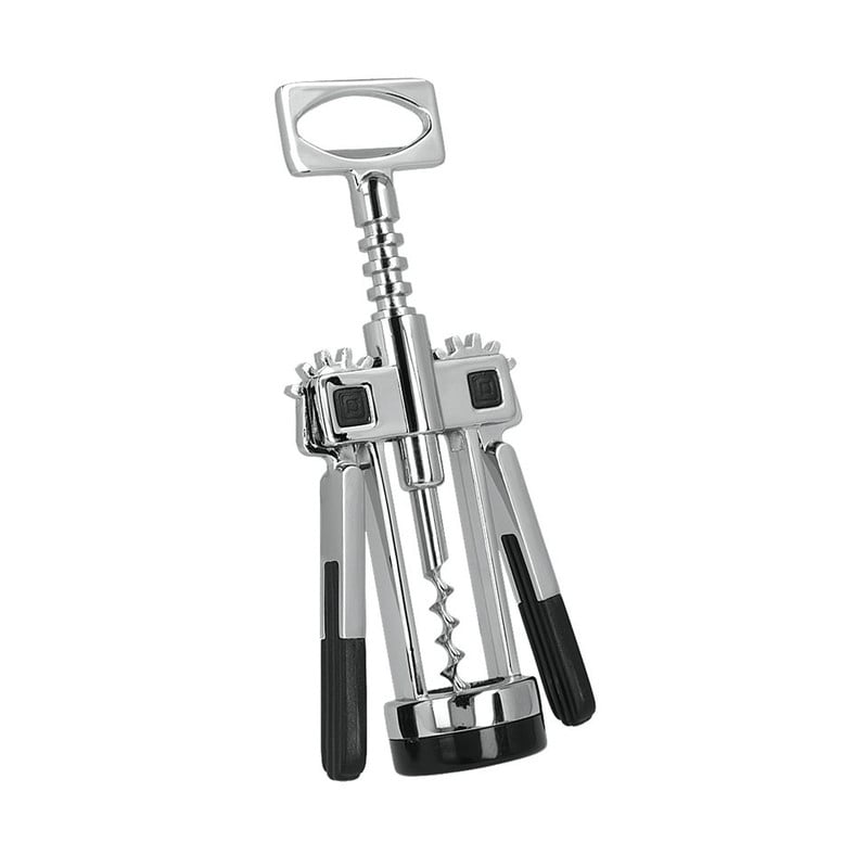 De verchroomde Metaltex kurkentrekker met dubbele vleugels om gemakkelijk de fles te openen. Behalve het hefboomsysteem heeft de kurkentrekker ook een flessenopener.