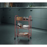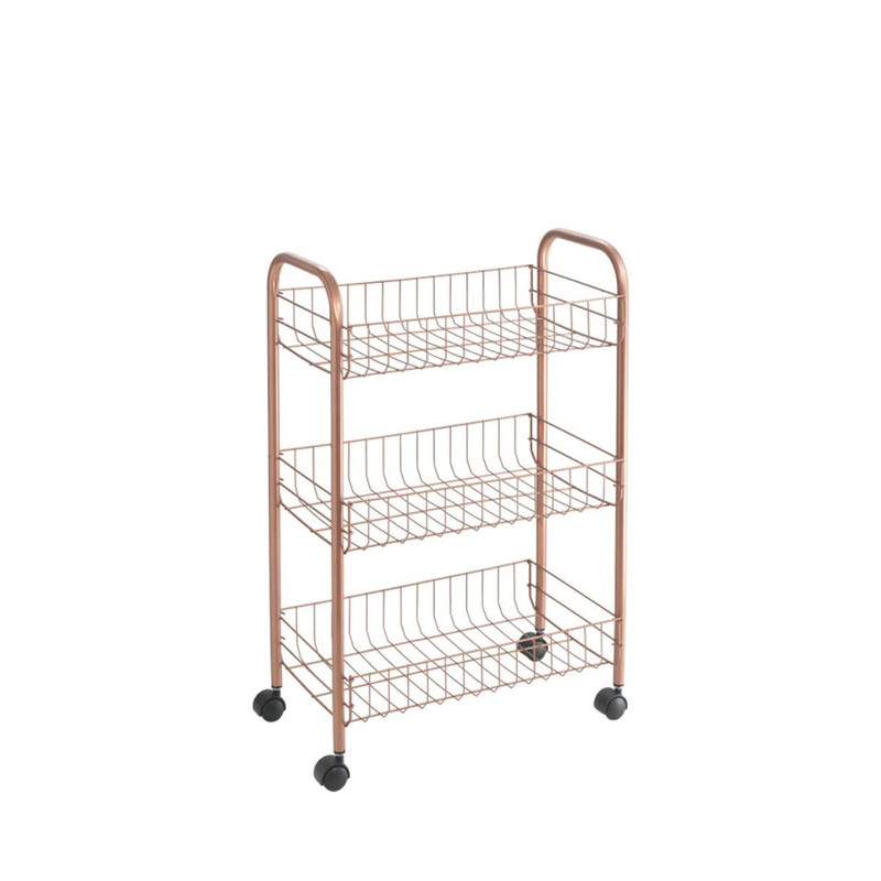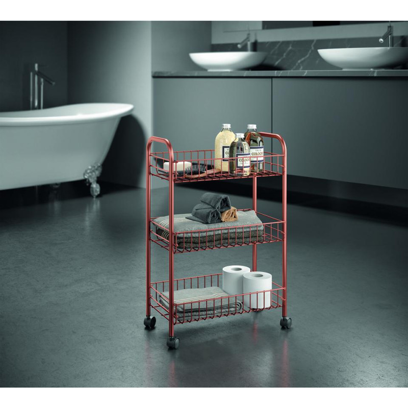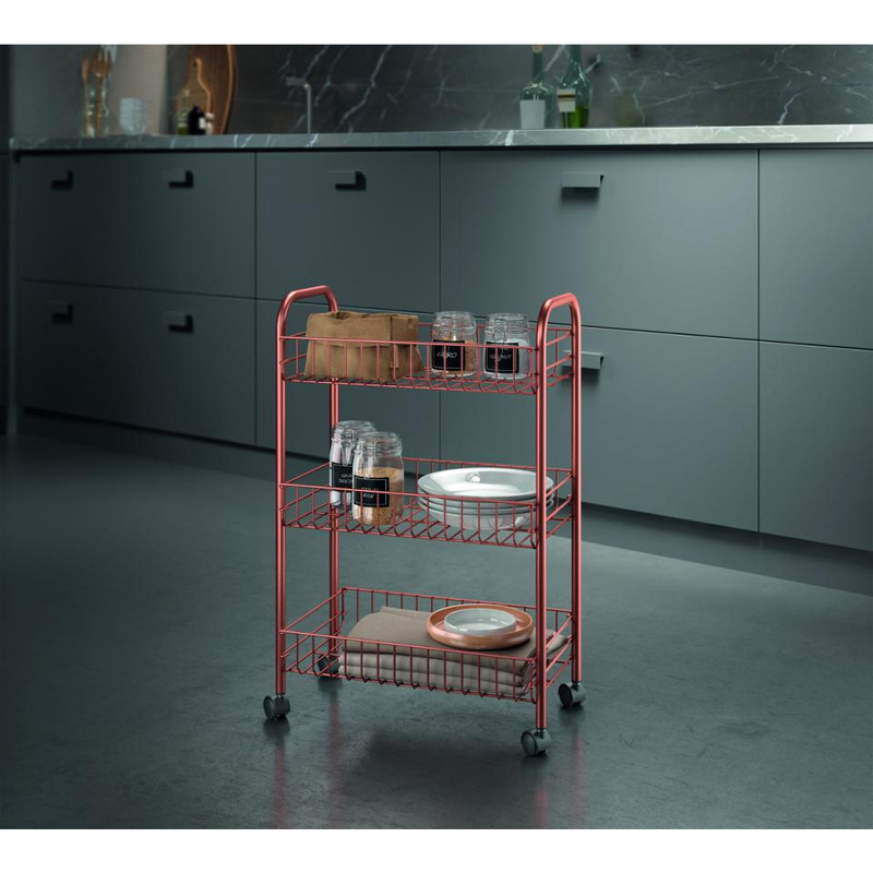 De Metaltex Lugano keukentrolley met 3 etages kan allerlei dingen bevatten: voedsel, dranken, reinigingsproducten.. Je kunt deze keukenorganiser ook in je badkamer gebruiken om je wasmiddelen of zeep en shampoos op te bergen. Je kan de Lugano verder ook in de garage gebruiken om tuinproducten of andere spullen in op te bergen. Een nieuw patent maakt het aansluiten van de verschillende delen zonder werktuig gemakkelijk. Dankzij de wieltjes is dit rek snel verplaatsbaar. De afmetingen zijn 41x26x64 cm. De Metaltex Lugano heeft een harde, kopere Polytherm coating.