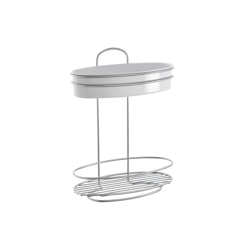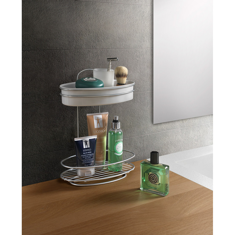 Het Metaltex Orbit multifunctioneel rekje kun je staand plaatsen of aan de wand hangen. De afmetingen zijn 26x13x35 cm. Het hangen kun je doen middels het Metaltex fixatiesetje: 2 haakjes en een tube superlijm. Deze zijn apart te bestellen. Dit Orbit rekje heeft 2 etages. Eén open rekje en één ovaal wit plastic bakje. Het Orbit rekje wordt beschermd door de nieuwe en exclusieve Chrometerm coating met een chroom uiterlijk. Het nieuwste resultaat van Metaltex onderzoek & ontwikkeling. Chrometherm is een eco-oplossing die beter is voor het milieu. Deze afwerklaag staat garant voor een lange levensduur door de uitstekende bescherming tegen roest. 6 jaar garantie! Gemaakt in Italië.