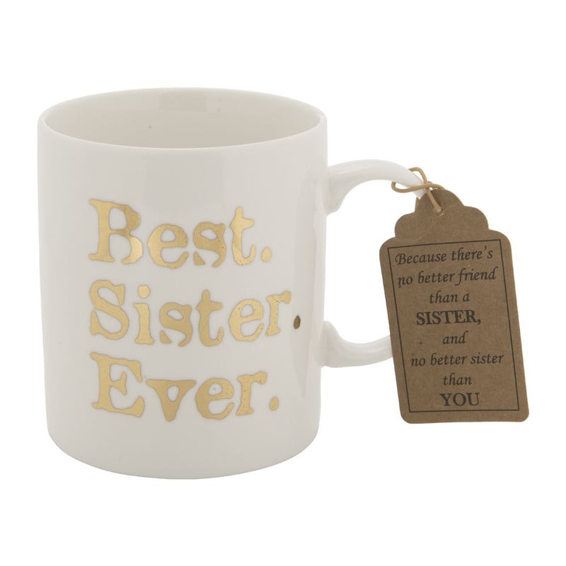 Witte mok om cadeau te geven aan jouw allerliefste zus. De mok heeft een inhoud van 35 cl en is gemaakt van porselein. Er staat in gouden letters de tekst 'Best. Sister. Ever.' op. Daarnaast hangt er nog een papieren kaartje aan met de tekst 'Because there's no better friend than a sister, and no better sister than you'.