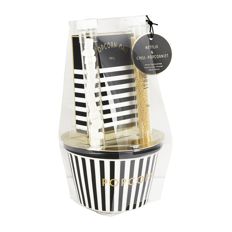 Deze popcornset is ideaal om te geven als cadeautje. De set bestaat uit popcornmaïs, een leuk popcornschaaltje en twee verschillende toppings.