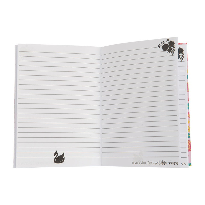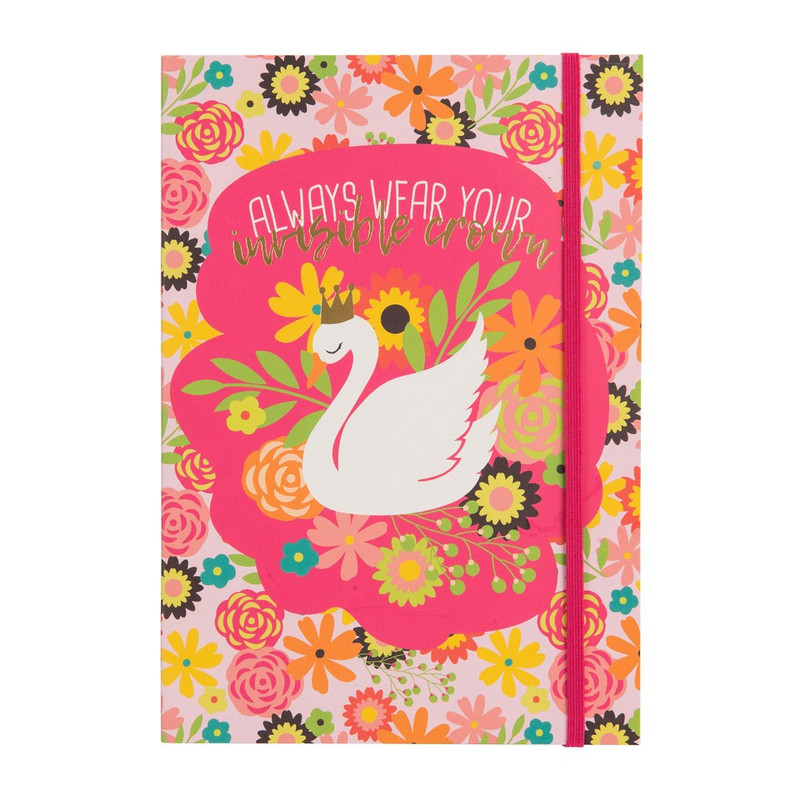 Dit A5 notitieboekje heeft een vrolijk design en de tekst 'always wear your invisible crown'. Dit notitieboekje heeft een leuk design aan de binnen- en buitenkant. Het bevat gelinieerd papier, waardoor je al je belangrijke notities netjes kunt opschrijven. Aan het boekje zit een elastiek, zodat deze gesloten blijft als je hem niet nodig hebt. De kartonnen kaft zorgt ervoor dat het boekje extra stevig is.