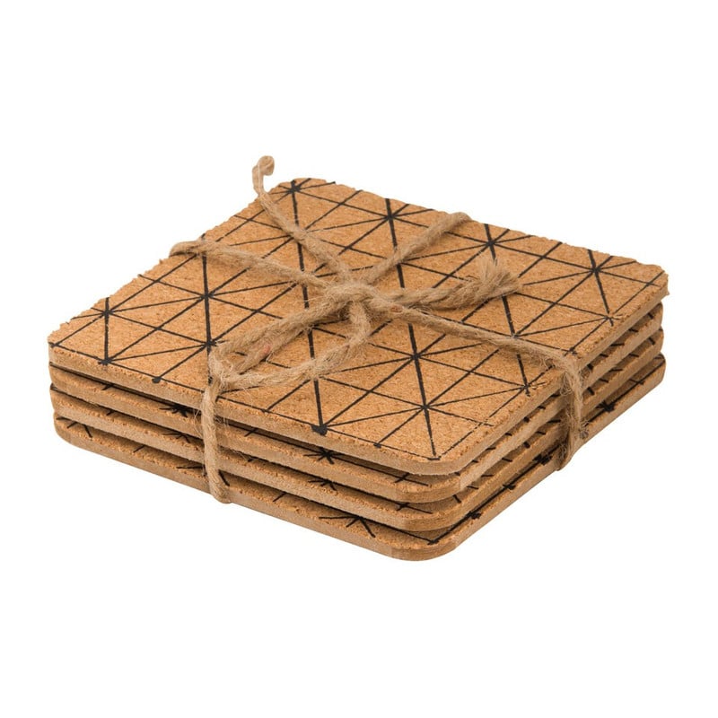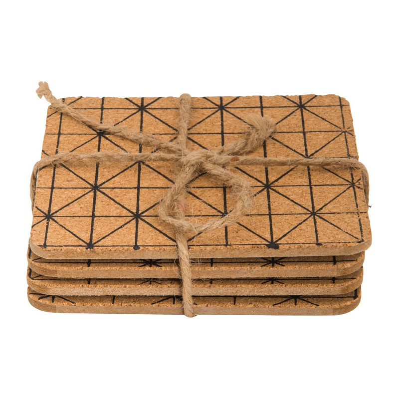 Bescherm je tafel tegen kringen en vlekken met deze onderzetters van kurk. De onderzetters zijn gemaakt van kurk en zijn voorzien van dopjes waardoor ze je tafel niet beschadigen. De set van 4 onderzetters hebben een strakke print van zwarte lijnen. De afmeting van de onderzetters is 10.5x10.5 cm.
